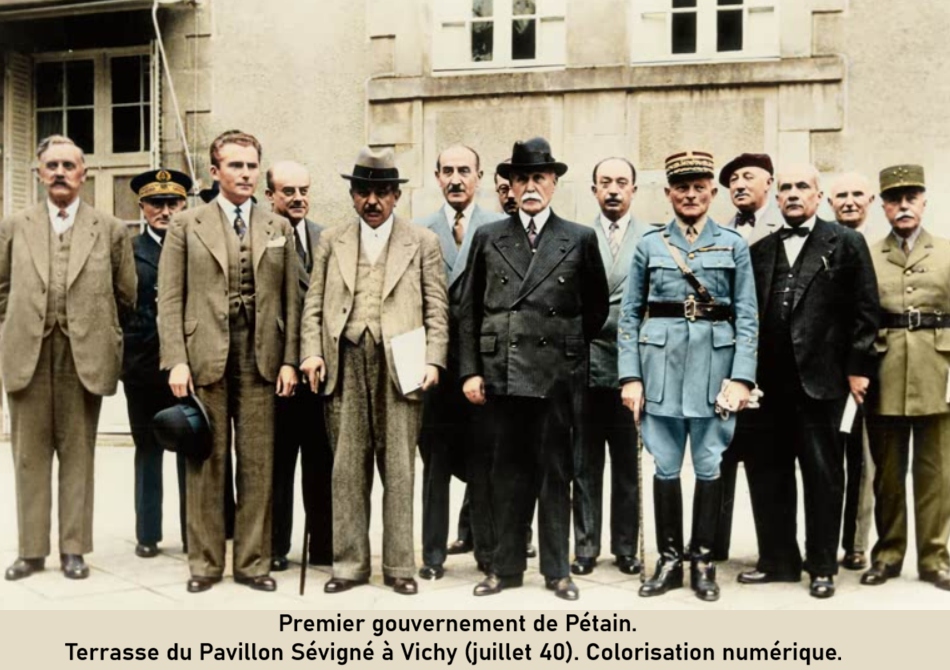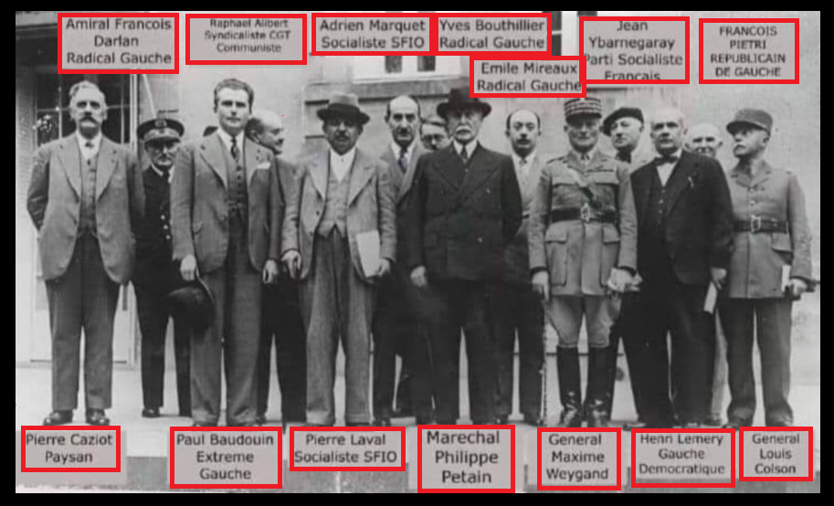 Sur les omissions et les mensonges déposés par l’extrême-droite sur les réseaux sociaux, revient très souvent cette photo (juillet 1940) des membres du premier gouvernement de Vichy, cliché accompagné de fausses légendes sur l’appartenance et le passé de ces mêmes membres d’avant 1940.